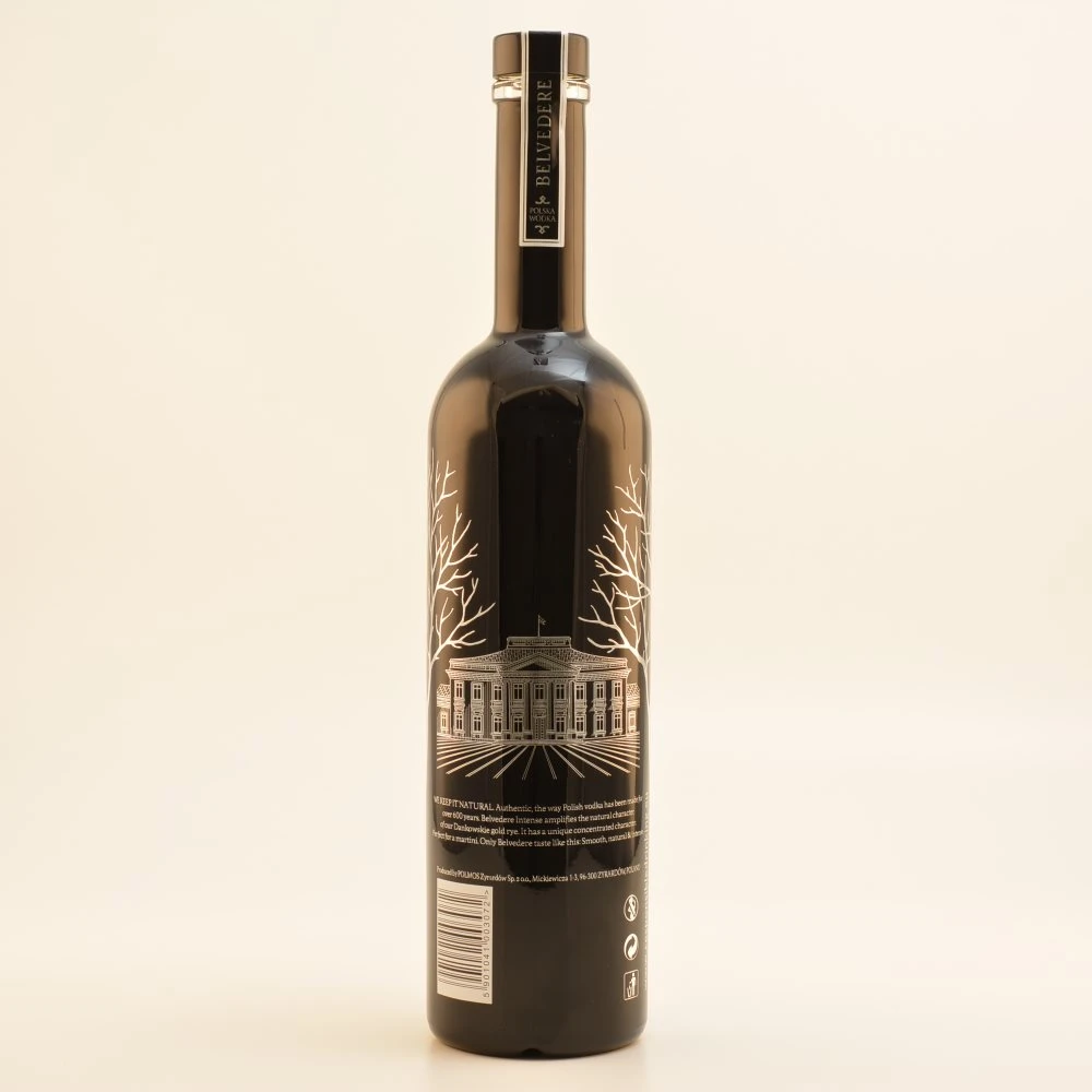 Wodkas der Belvedere Distillery in Polen können auf eine mehr als 500-jährige Vergangenheit zurückblicken. Mit all den Jahren haben sich die Rezeptur und das Herstellungsverfahren so gut wie nicht geändert, die Beliebtheit der Belvedere Wodkas ist jedoch noch gestiegen. Auch der Belvedere Vodka Intense 50% wird aus 100 % Roggen gewonnen, was sich in seinem Geschmack durchschlägt. Sein Aroma ist trotz seiner Intensität eher sanft und süßlich und lässt einen Hauch von Zitrone erahnen. Der einmalig hohe Alkoholgehalt von 50 % vol. wirkt sich dahingehen auf den Vodka aus, dass seine einzelnen Geschmacksnoten viel stärker auftreten. Er schmeckt sehr würzig, wobei man Nuancen von Schokolade und Karamell herausspüren kann. Durch seine Würzigkeit hat er etwas mit Whiskys und Cognacs zu tun, erhält sich aber dennoch seine typische Wodka-Note.