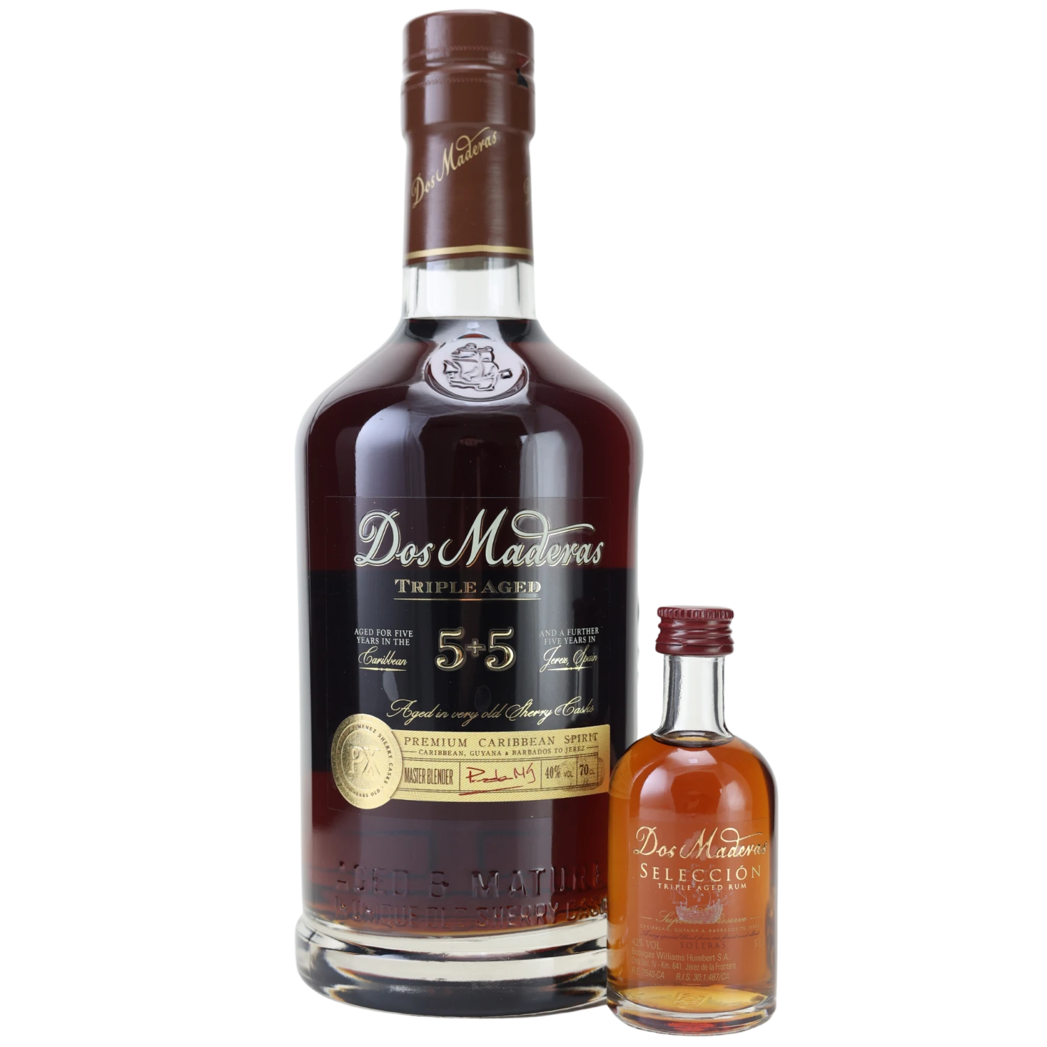 Die Hauptrolle in der Dos Maderas 5+5 + Dos Maderas Seleccion Geschenkbox spielt der 5 + 5 Rum. Sein Name ist ein Hinweis darauf, dass der Blend mit Destillaten aus Barbados und Guayana zunächst einmal fünf Jahre in amerikanischen Eichenfässern in der Karibik reifte. Danach lagerte er in Palo-Cortado-Sherryfässern sowie in Pedro-Ximenez-Sherryfässern. Das Ergebnis ist ein fruchtbetonter und süßer, komplexer Rum mit Sherrynoten und einer sanften Würze. Ebenfalls im Dos Maderas 5+5 + Dos Maderas Seleccion Geschenkbox Spirituosenset enthalten ist eine kleine Flasche des Seleccion Rums. Dies ist ein edler, lang gereifter Premium-Rum, der auf dem 5 + 5 aufbaut.