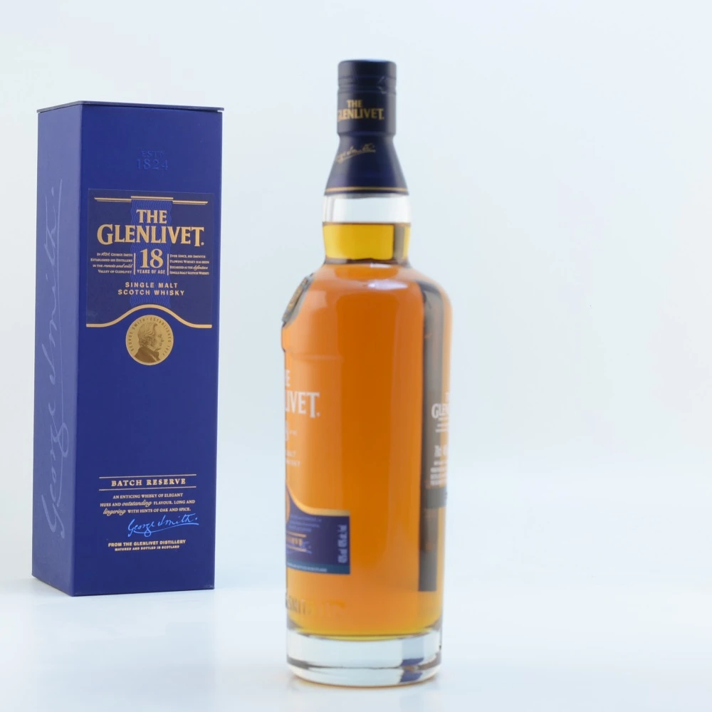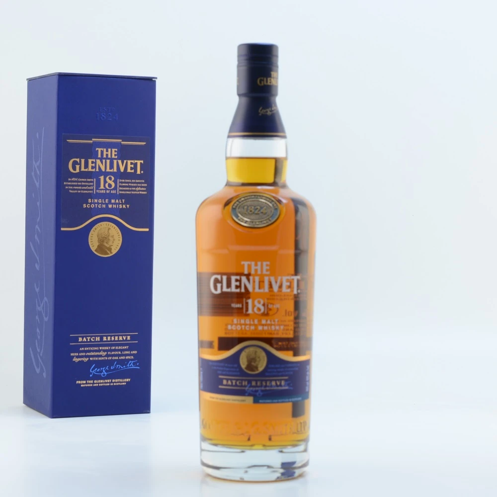 Der Glenlivet 18 Jahre Single Malt Scotch Whisky wird von vielen Whisky-Kennern als einer der besten Single Malts überhaupt bezeichnet und gilt außerdem als einer der am besten ausbalancierten Whiskys. Dieser eher trockene und herbe schottische Highland Malt, der in amerikanischen Weißeichenfässern gelagert wurde, besticht durch seinen Duft nach Birne, Torf und etwas Eichenholz. Das Aroma ist intensiv, etwas rauchig sowie fruchtig-süß mit Anklängen an Torf, Eiche, Honig, Karamell sowie Pfirsich. Auch Nuss und Passionsfrucht können herausgeschmeckt werden.