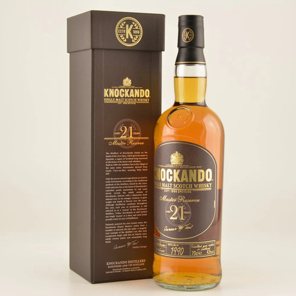 Die schottische Region Speyside ist die Wiege zahlreicher Scotch-Whiskys, die bei Liebhabern weit über die Grenzen des Landes hinaus sehr geschätzt werden. Die Knockando Distillery, aus welcher auch der Knockando 21 Jahre Master Reserve Whisky kommt, wurde von Jan Thomson im Jahre 1898 gegründet. Anfangs verfügte die Destillerie über zwei Brennblasen, deren Anzahl 1969 auf vier erhöht wurde. Im Beisein der damaligen Premierministerin Margaret Thatcher wurde 1985 die einmilliardste Flasche abgefüllt.