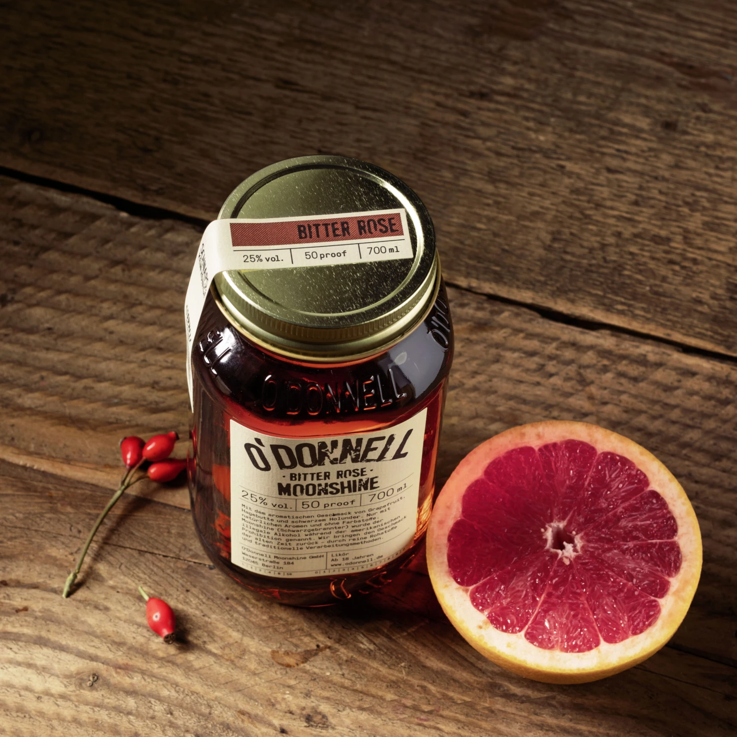 Der außergewöhnliche O’Donnell Original Moonshine Bitter Rose mit seinem amerikanischen Namen und seinem einzigartigen Charakter ist bereits die zweite Veröffentlichung der Marke O’Donnell Moonshine, die in Deutschland von August Ullrich auf die Beine gestellt wurde. Den Anfang machte man mit der raffinierten Abfüllung O’Donnell Moonshine Bratapfel mit ihrem winterlichen bis weihnachtlichen Flair, und auch der O’Donnell Original Moonshine Bitter Rose hat rechtzeitig vor Weihnachten 2015 seinen Weg auf den Markt gefunden. Er setzt auf eine faszinierende Kombination aus Holunder, Hagebutte (von Rosen) und Grapefruit und tanzt damit aus der Reihe. Die Grundlage ist ein feiner Weizenbrand, und nur natürliche Zutaten kommen zum Einsatz, was dem Hersteller sehr wichtig ist.