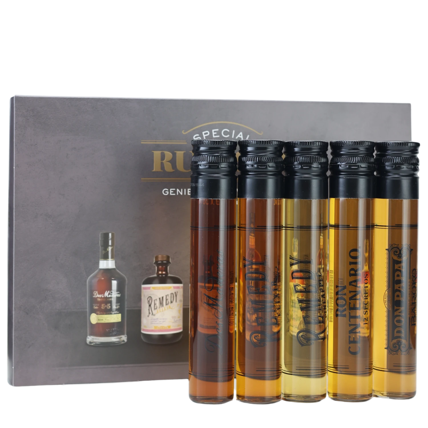 Beim Rum kaufen gibt es die Qual der Wahl. Für jede Vorliebe, jeden Anlass bzw. Verwendungszweck und jeden Alkoholgehalt gibt es etwas Passendes zu finden. Genau aus diesem Grund bietet es sich an, sich mit Mini-Flaschen zum Probieren oder mit Probiersets an die Thematik heranzuwagen. Wie wäre es beispielsweise mit dem raffiniert zusammengestellten, fünfteiligen Special Rum Tasting Set bis 40%? Es entführt den Genießer nicht nur in zahlreiche Länder, sondern macht es auch möglich, mehrere Stilrichtungen an Rum kennenzulernen.