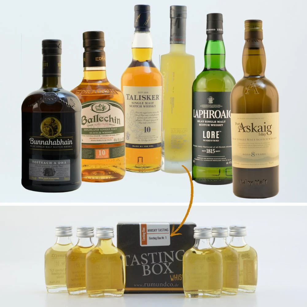 Das exklusive Whisky Tasting Set: Kenner Box Nr. 3 von Rum & Co ermöglicht es unseren Kunden, sich auf eine Entdeckungsreise zu begeben. Nicht nur deckt es mehrere Whiskyregionen und Destillerien ab, sondern es rückt auch den maritim geprägten Inselwhisky aus Islay in der Mittelpunkt der Aufmerksamkeit. Auf der Hebrideninsel haben mehrere Brennereien ihren Sitz, die sich vor allem dem rauchigen, getorften Single Malt widmen. Genau aus diesem Grund umfasst das 6-teilige Whisky Tasting Set: Kenner Box Nr. 3 mit Miniaturen von jeweils 2 cl Inhalt auch den legendären Octomore Whisky der Bruichladdich Distillery, der nicht nur hochprozentig, sondern auch ausgesprochen rauchig ist.